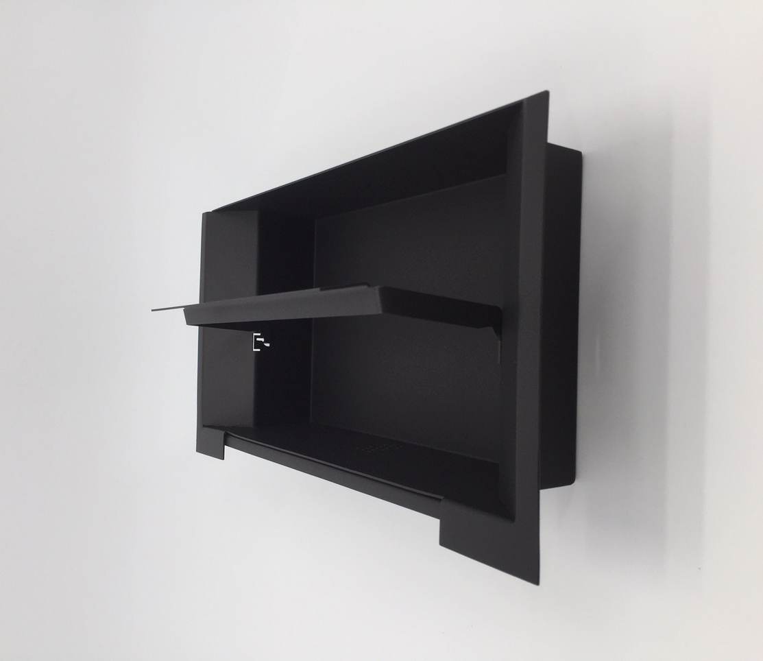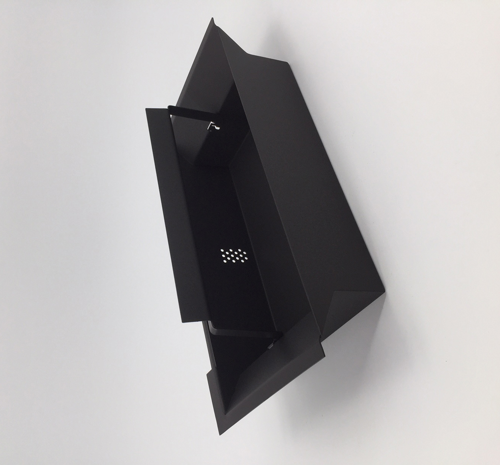 Stahlblech, schwarz lackiert, mit Klappgriff zur leichten Entnahme