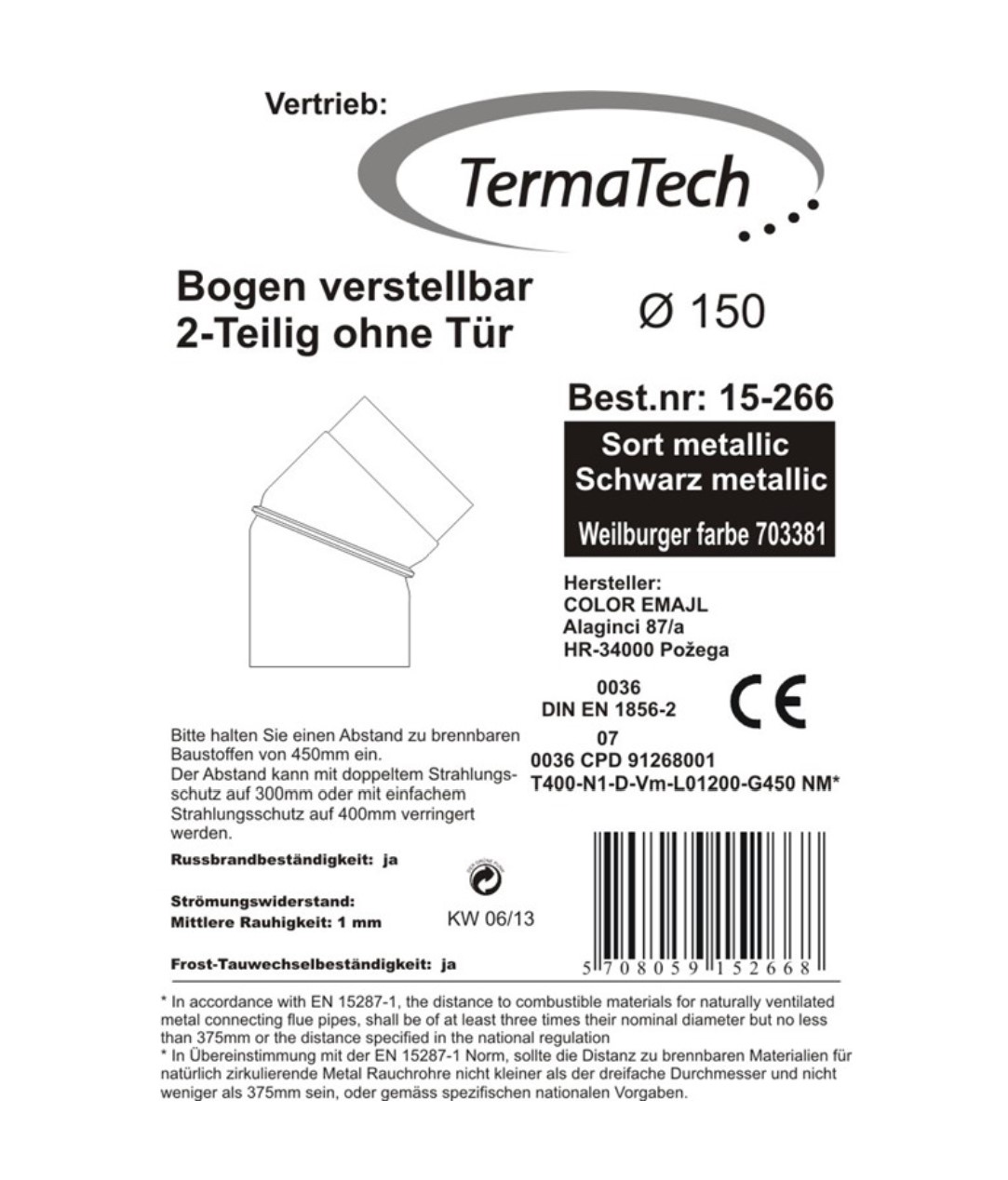 Produktinformationen "Rauchrohr Bogen 0-45° verstellbar schwarz DN150"